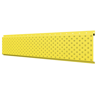 Линеарная потолочно-стеновая панель с ПЕРФОРАЦИЕЙ для вентиляции цвет RAL1018 Желтый применяется в качестве софитов для подшивы крыши, наружной и внутренней отделки потолков, стен, фронтонов фасада дома в Новосибирске.