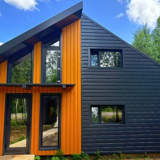 Металлосайдинг Евро-Брус под брус цвет Тик, RAL7024 Серый Графит на фасаде барнхауса