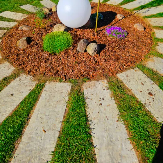 Фото 2 шаговая плита Stone Светлая Галька на оригинальной садовой дорожке