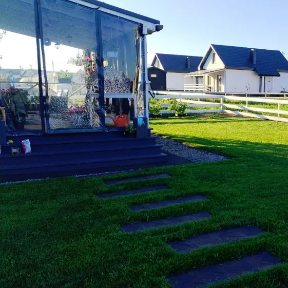 Шаговая плита STONE Черный Сланец на участке, Шаговые плиты для придомовой зоны и садовых дорожек, Пошаговая плита STONE Черный Сланец на садовой дорожке